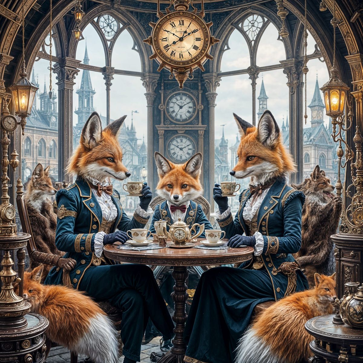 A digital painting shows a family of steampunk foxes in Victorian attire enjoying tea inside a clock tower. Intricate mechanisms and glowing lights enhance this miniature world in a fantasy concept art style.