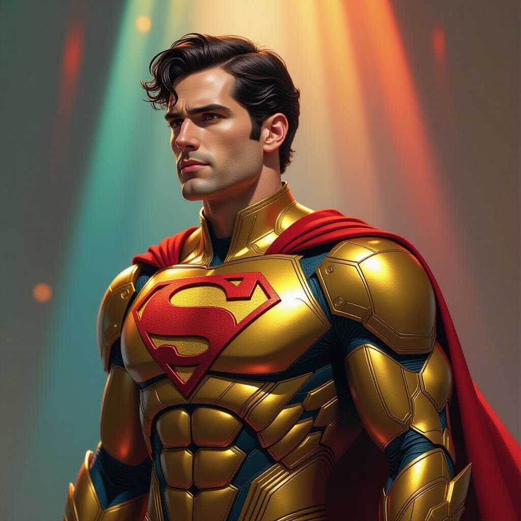This image shows Superman in a full gold suit, rendered in a hyperrealistic splash art style. The portrait features intricate textures, dynamic side lighting, and a colorful, vibrant background with deep color depth.