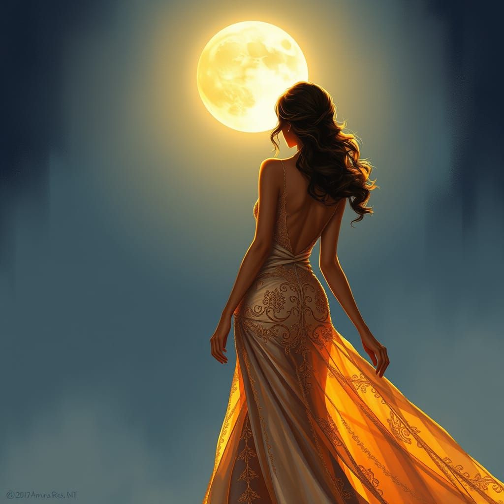 A stunning image of a Latina woman in a golden gown walking away under moonlight. The artwork showcases intricate details, realistic fabrics, and a blend of vibrant colors and expressive lines.