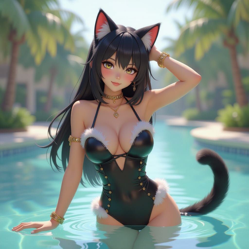 This image shows an Egyptian cat-girl in a swimsuit made of cat fur, striking a graceful pose. The artwork is detailed 3D anime art, with textures and vibrant aesthetics.