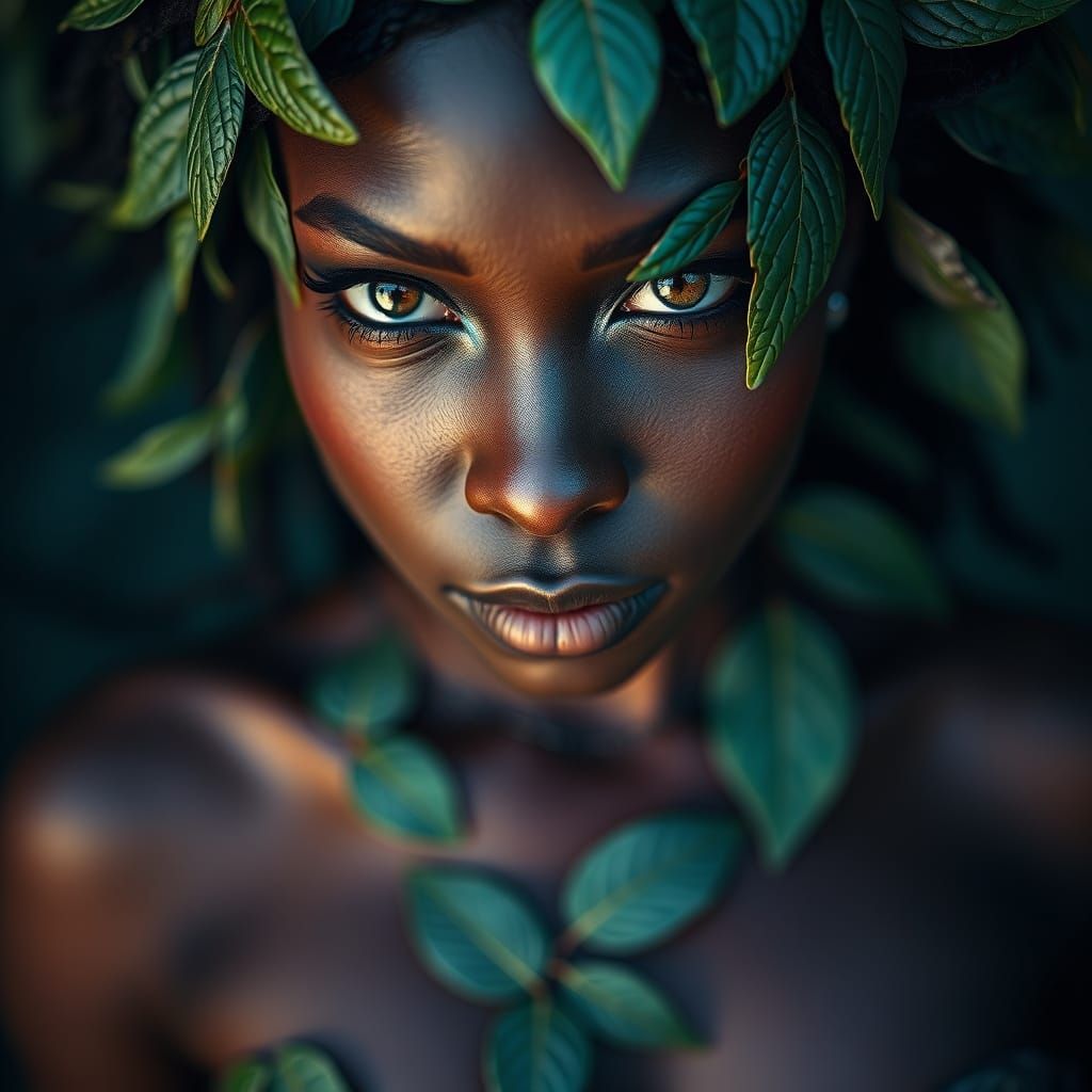 This image shows a dark-skinned goddess of sensuality wearing a microkini made of leaves. The close-up portrait features studio lighting and a shallow depth of field.