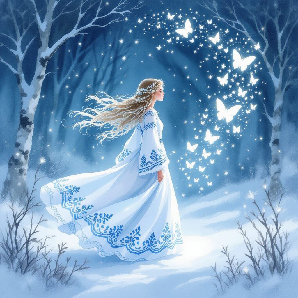 This image shows a watercolor painting of a Ukrainian fairy tale scene in winter, with a girl named Darina searching for the ghosts of her family. The artwork features swirling snowflakes and butterflies.