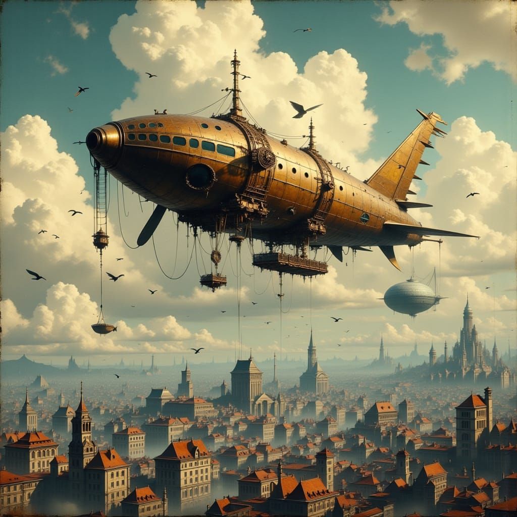 A detailed digital painting of a steampunk airship flying over a Victorian city. The airship is brass and copper, with gears and propellers. The city has towering buildings in a warm color palette.