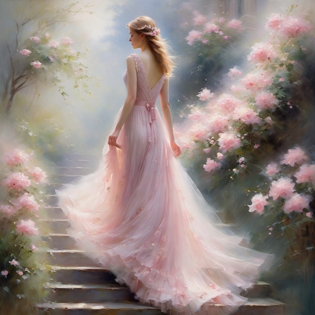 This impressionist painting depicts an elegant woman in a flowing sheer dress descending a staircase amidst blooming pink flowers. The scene has soft, dreamy lighting and a romantic, painterly quality.