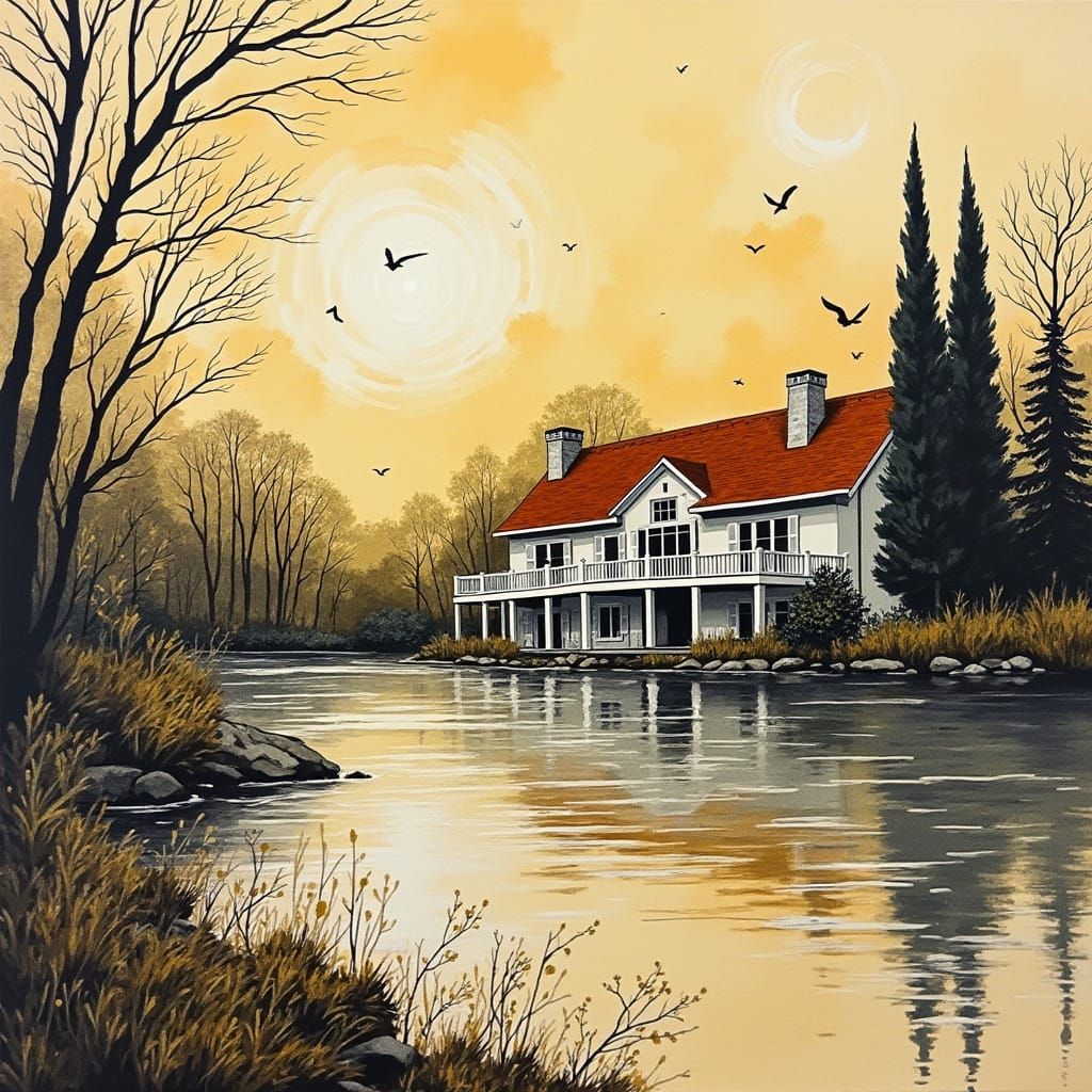 This image shows an abstract lakeside manor in high contrast. The artwork features rough ink linework with gold and ivory, accented by a single contrasting color, creating a retro and mirrored effect.