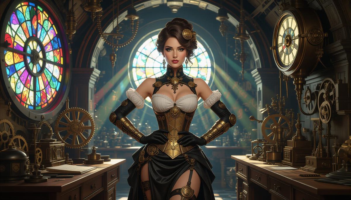 This image shows a steampunk woman in a hidden workshop. Light streams through stained glass, illuminating gears and arcane devices in this hyperrealistic digital painting with deep colors and intricate details.
