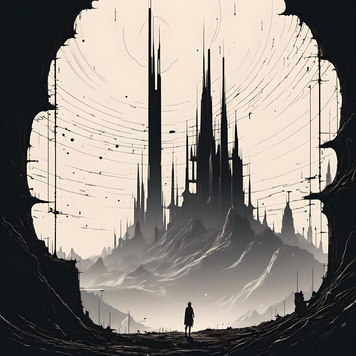 This image shows a minimalist black and white science fiction illustration. The silhouette features a futuristic citadel, resembling a small, high, thin fantasy tower.