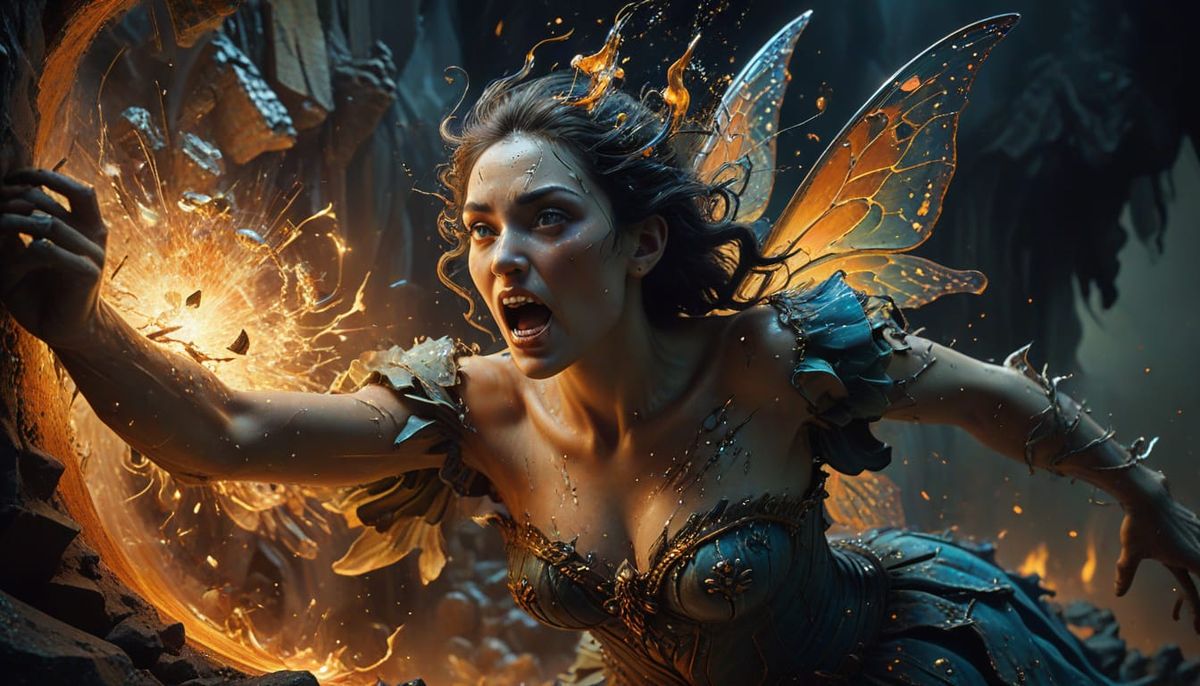 A surreal oil painting depicting a fairy bursting forth from a shattered ogre. Features ethereal glow, abstract patterns, and dramatic contrast in a dark fantasy aesthetic.