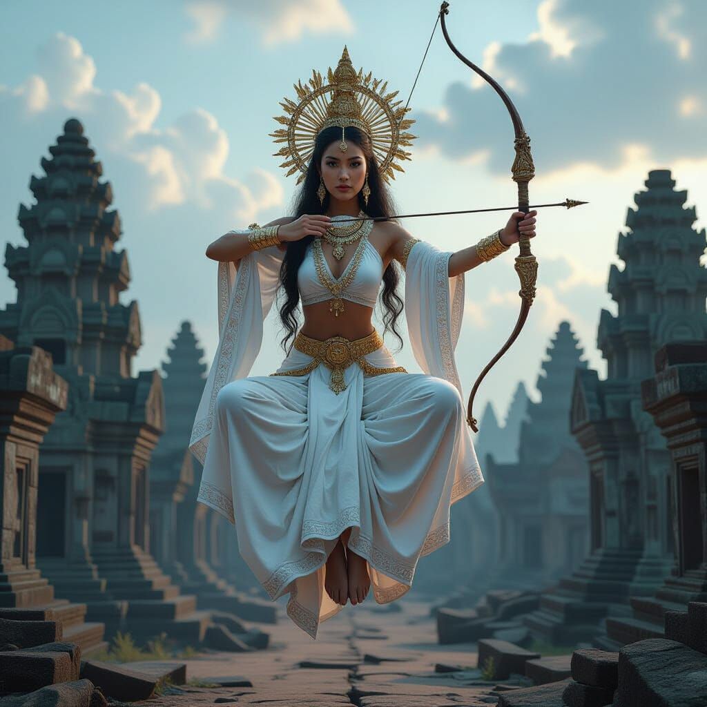 A photorealistic image of a prophetess levitating over a ruined city. She wears a white dress with Angkor patterns and holds a bow, with atmospheric lighting and textures, in a romantic style.