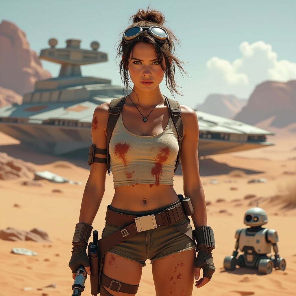 This image shows Rey, a scavenger on a desert planet near a crashed Star Destroyer. She has messy brown hair and welding goggles, wearing a worn tank top and hot pants in a gritty sci-fi aesthetic.