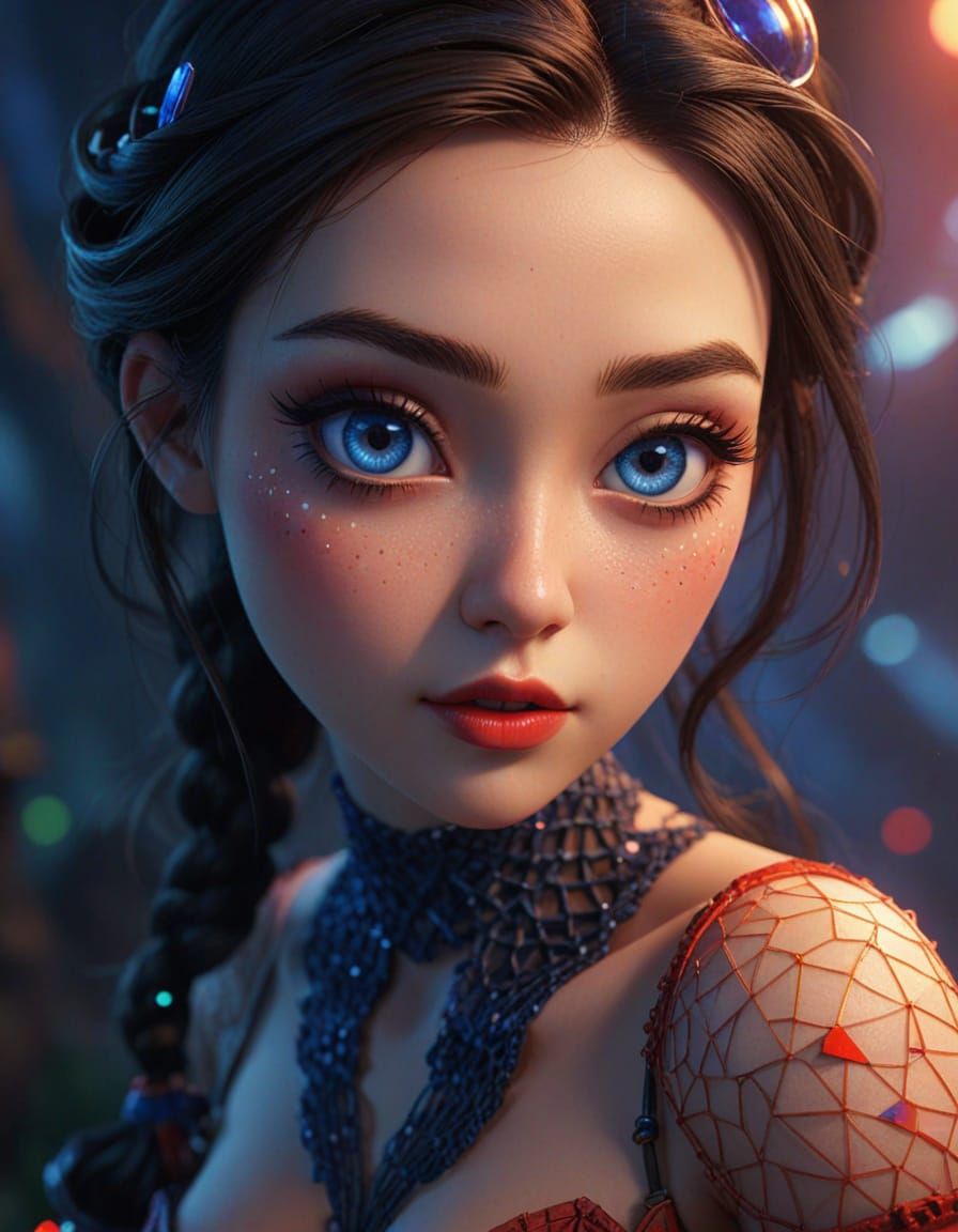 This image shows a cute, anime-style waifu with large blue eyes and an hourglass figure, set against an abstract geometric background with neon colors. It has a photorealistic, 3D-rendered look.