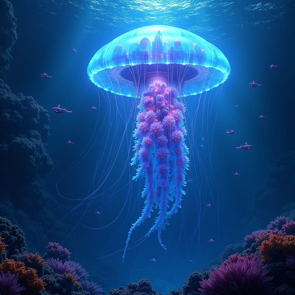 A stunning image of a gigantic bioluminescent jellyfish floating through a coral reef. The jellyfish is adorned with glowing cityscapes, with submarines and neon fish surrounding it. Rendered in hyperrealistic digital art.