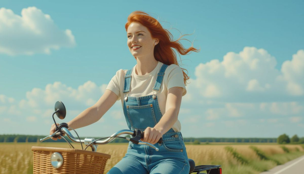 A striking picture of a red-haired woman riding a bicycle on a sunny day. The image is photorealistic with vibrant colors and cinematic depth reminiscent of documentary photography.