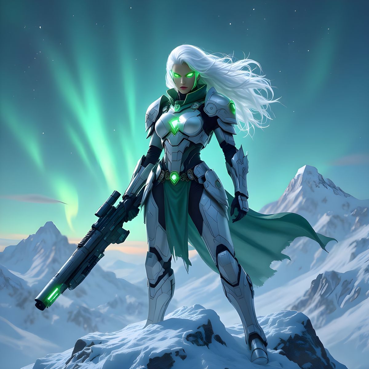 A striking picture of a robotic Valkyrie warrior standing on a frozen mountain. The sky crackles with auroral energy, illuminating the futuristic landscape in a cinematic style.