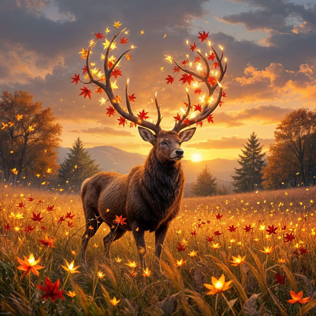 This image shows a fire-red stag spirit with burning leaf antlers in a golden meadow at dusk. With every step, grass ignites into glowing flowers, creating a mystical, hyperdetailed fantasy art piece with warm lighting.