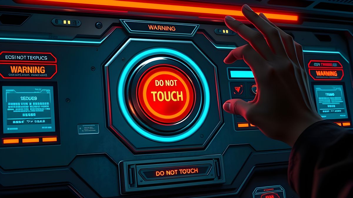 A large control board with a big red button marked "Do Not Touch" and a hand approaching.