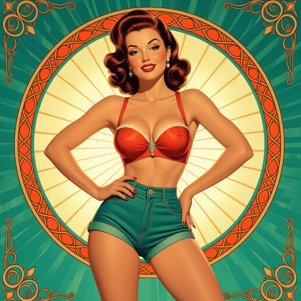 This image shows a woman in 1950s pin-up style. She is wearing vintage bullet bra, high-waisted shorts, and heels. The image is hyperdetailed, with art nouveau flair and vibrant colors, reminiscent of digital art.