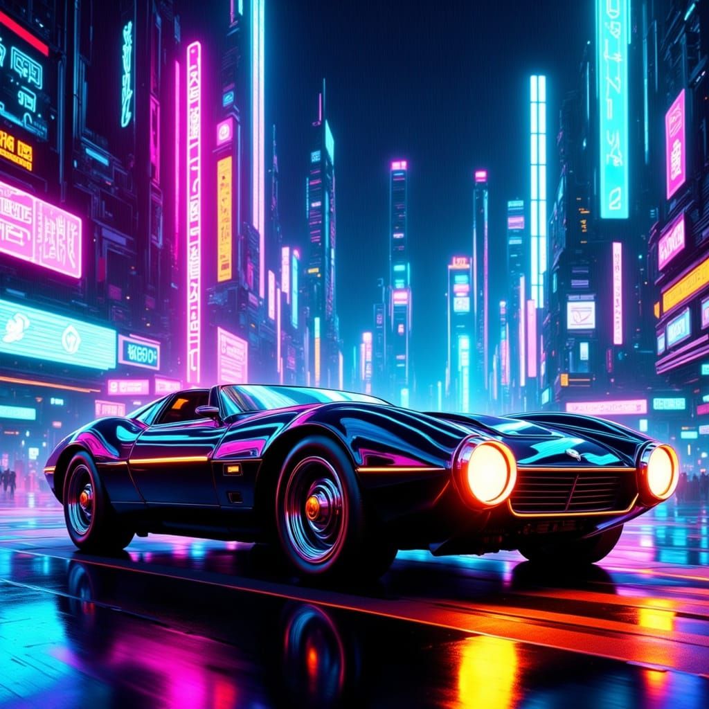 A vintage roadster races through a vibrant cyberpunk city at night. Rain streaks reflect neon lights from skyscrapers and holographic ads, all rendered in a cinematic, futuristic style.