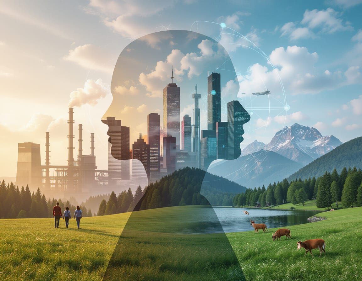 This image depicts a silhouette bisected to show a vibrant urban scene on one side and a tranquil natural landscape on the other, connected through abstract elements. The artwork features a realistic style with fantasy elements.