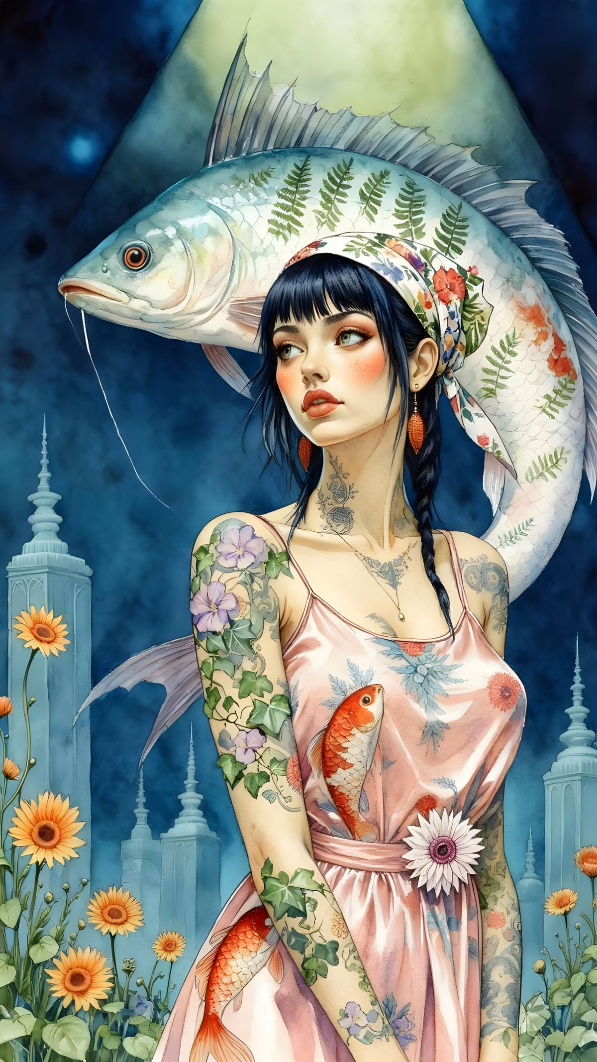 A limited-palette water-colour painting of a young woman (koi-pattern light-pink satin sundress; floral-and-ferns pattern headscarf; ivy and morning-glory pattern tattoos) standing in front of a giant hybrid oarfish/koi; . Indigo/olive gradient overhead lighting; intricate details; perfect anatomy; pinup ...
