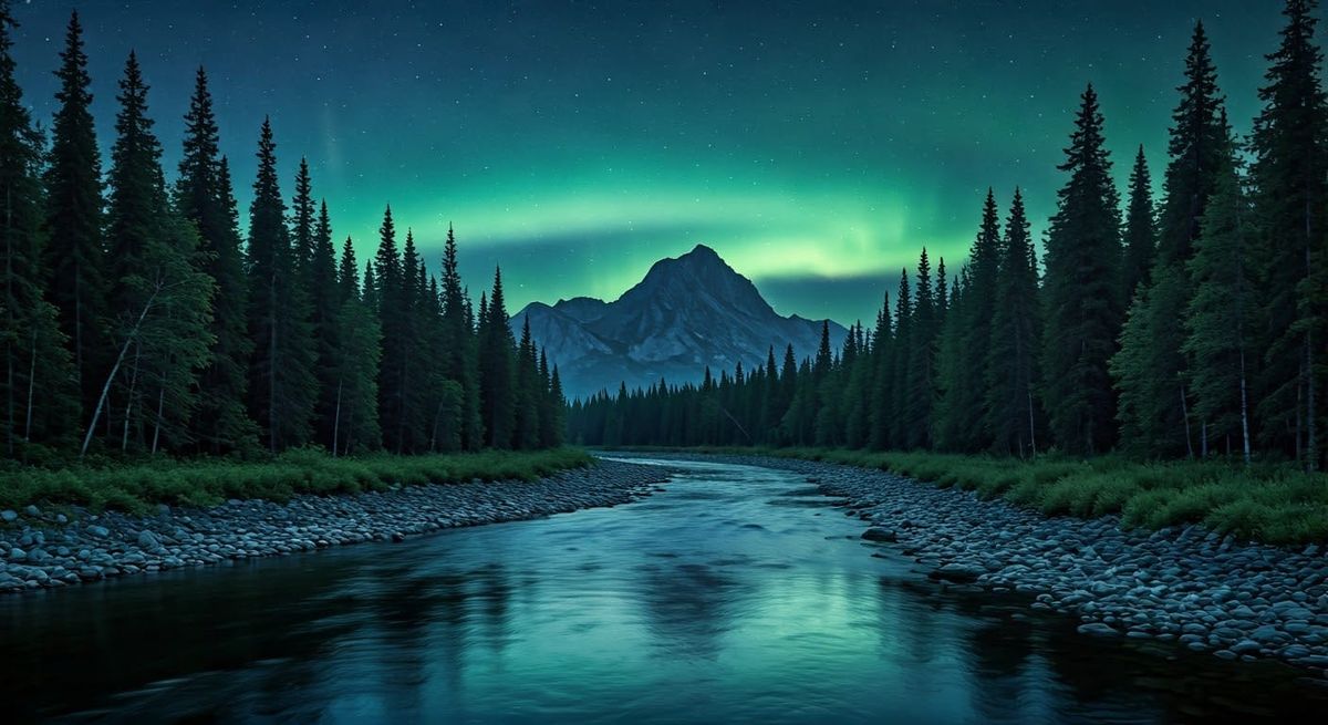This image captures a peaceful river at night, winding through a dense forest, with majestic mountains and the vibrant Northern Lights in the background, creating a mystical atmosphere