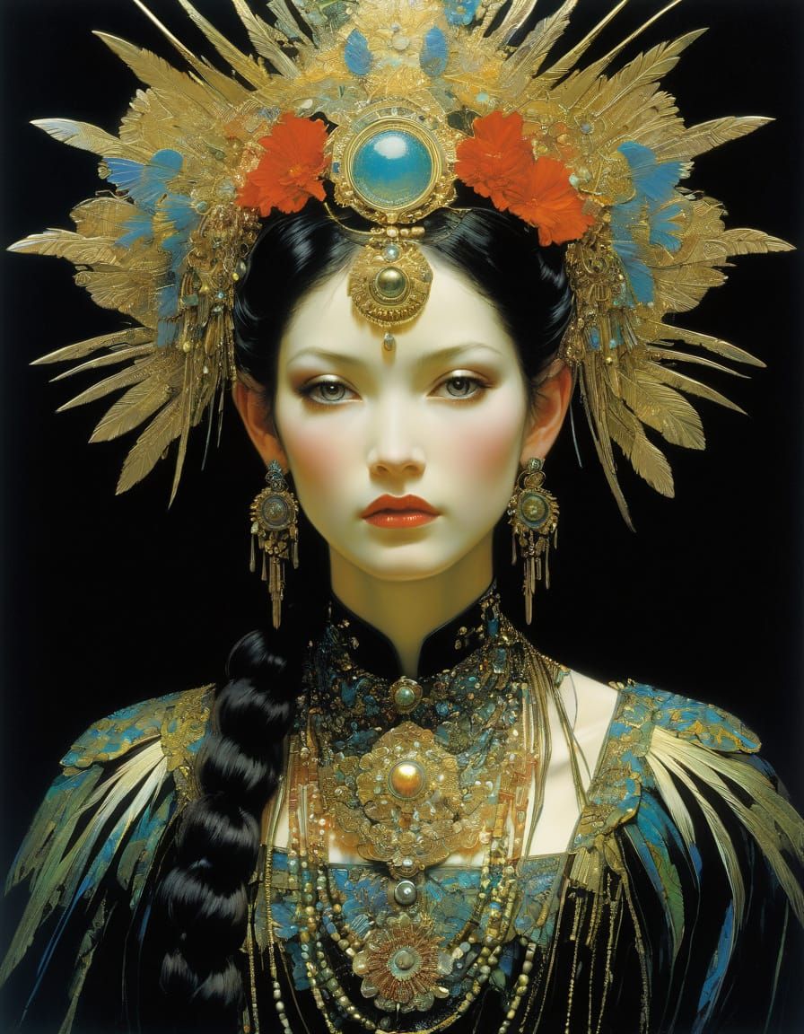 This image is a dreamlike representation of a goddess in an Art Nouveau-inspired organic line drawing style, blending elements of Art Nouveau and Symbolism with a touch of Japanese and European influences.