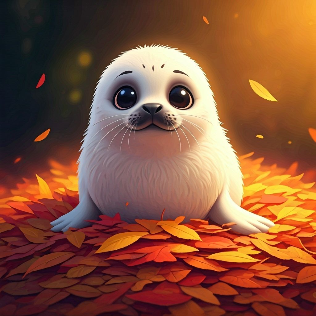 A heartwarming image of a fluffy white seal with large eyes playing in colorful autumn leaves, in a cozy Disney animation style with soft lighting and a warm color palette.