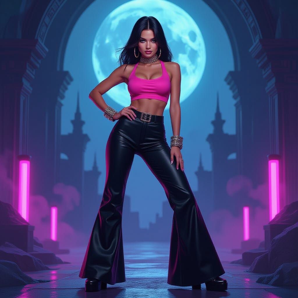 A digital painting of a demon princess in retro-futuristic attire, set in a mystical realm. The artwork features vibrant neon accents and draws inspiration from 70s fashion.