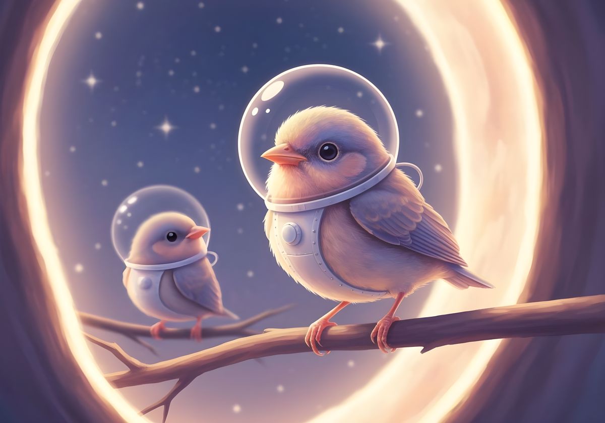 A sweet, futuristic baby bird rests on a branch, with a cosmic portal softly reflected. This ethereal mixed media artwork features warm tones and delicate shadows.