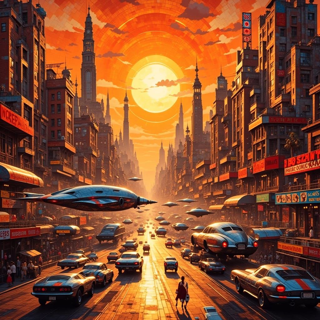 A cinematic wide-angle view of a vibrant retro city at sunset. Towering art deco buildings with neon signs and chrome hover cars are bathed in warm orange light, with a nostalgic film grain effect.