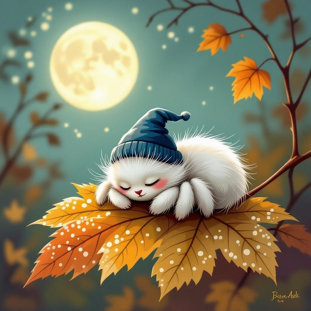 This image shows a charming, fluffy spider asleep on a dew-kissed autumn leaf, illuminated by moonlight. Rendered in a whimsical, storybook illustration style with an ethereal glow.