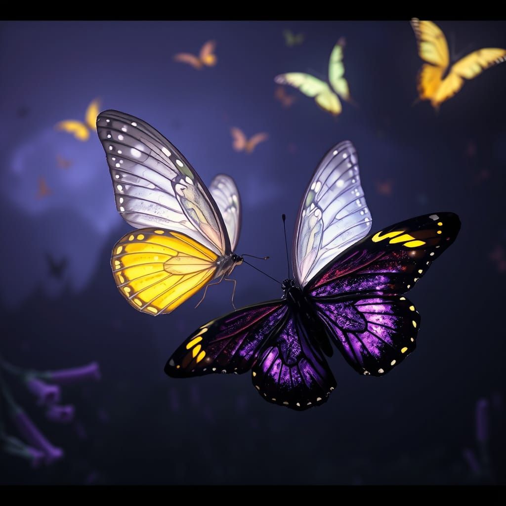 This image shows two butterflies, one black and one white, in a dark fantasy landscape. The image features dynamic lighting, detailed textures, and vibrant purple and yellow hues, reminiscent of art nouveau.