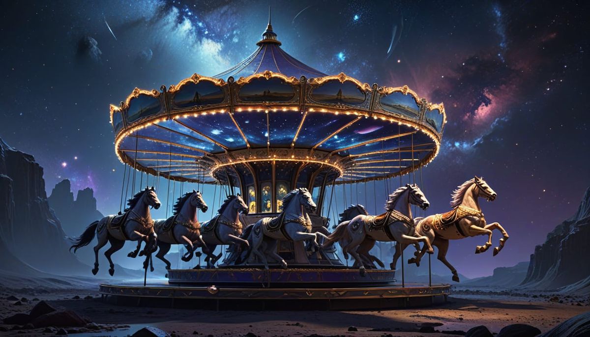 This hyperrealistic digital art captures a vintage carousel at midnight, horses frozen mid-gallop against a swirling, starry cosmic sky. Features ethereal glow and dramatic chiaroscuro lighting.