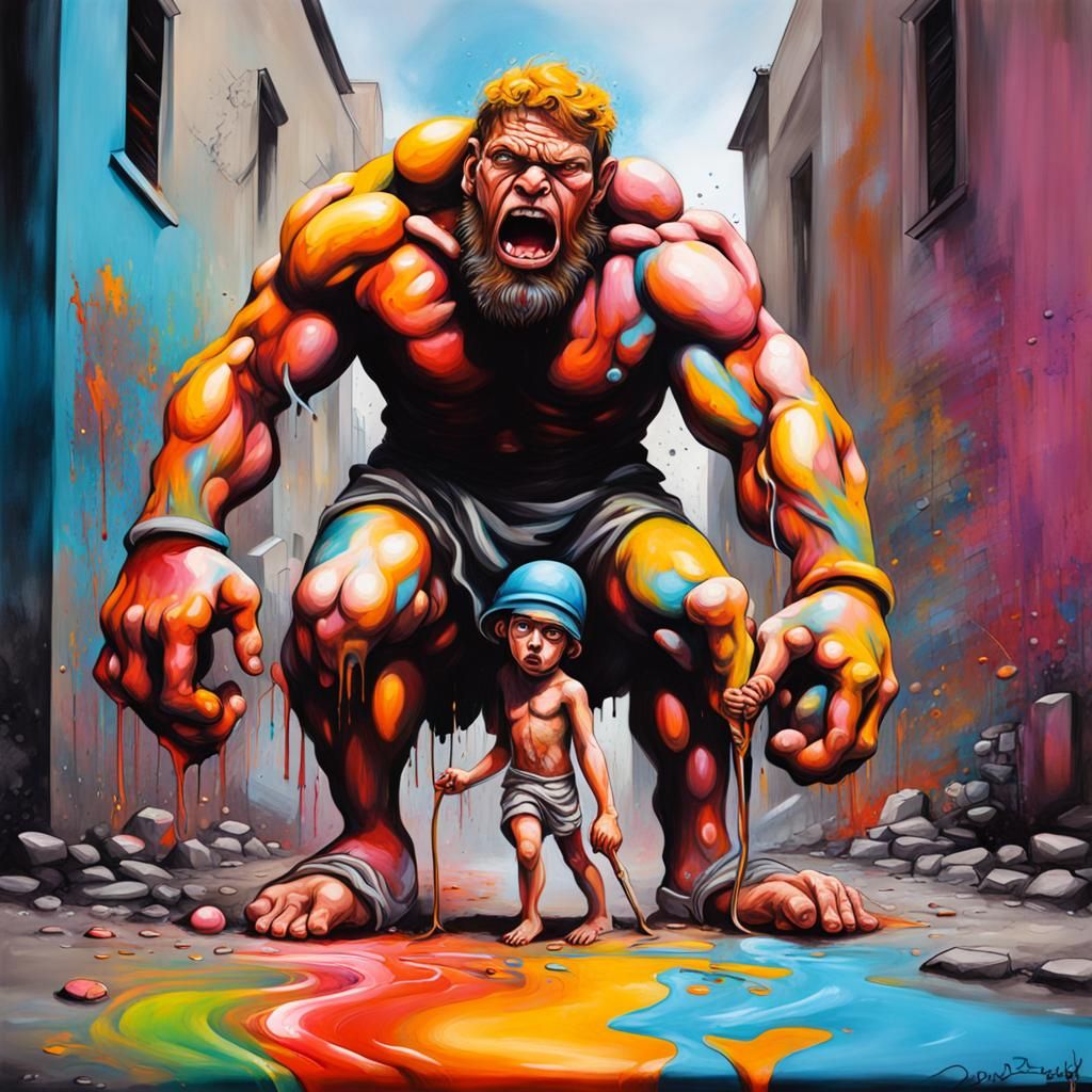This image shows David and Goliath in a graffiti art style. The vivid, ultra-detailed painting uses spray paint and acrylic with melting oil gouache to create high contrast.