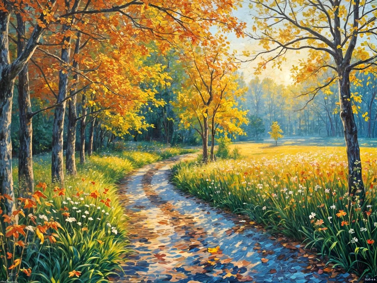 A vibrant oil painting of a serene natural scene. The artwork employs impasto techniques and rich colors to capture light and shadow, reminiscent of Impressionism.
