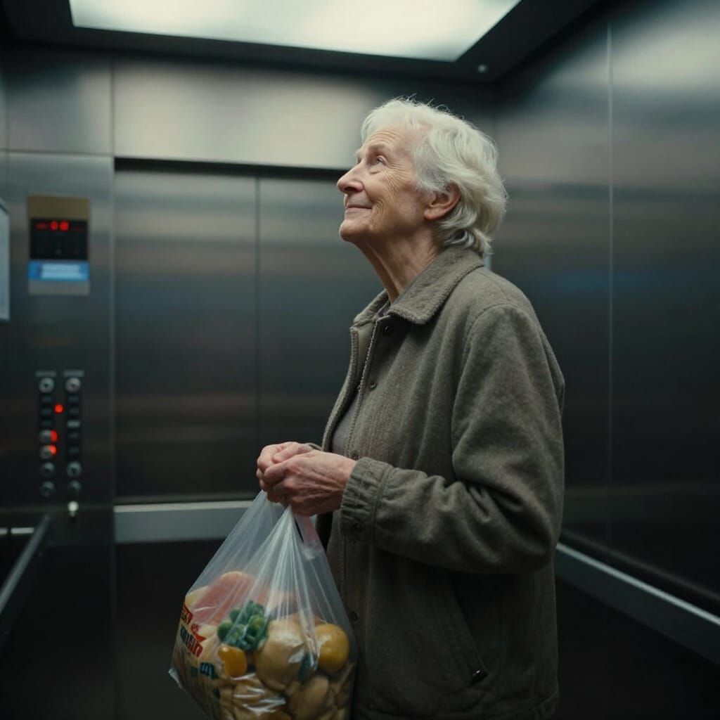 This image captures an elderly individual in an elevator, holding groceries and smiling faintly. The hyperrealistic style emphasizes a tranquil, introspective moment with cinematic lighting.