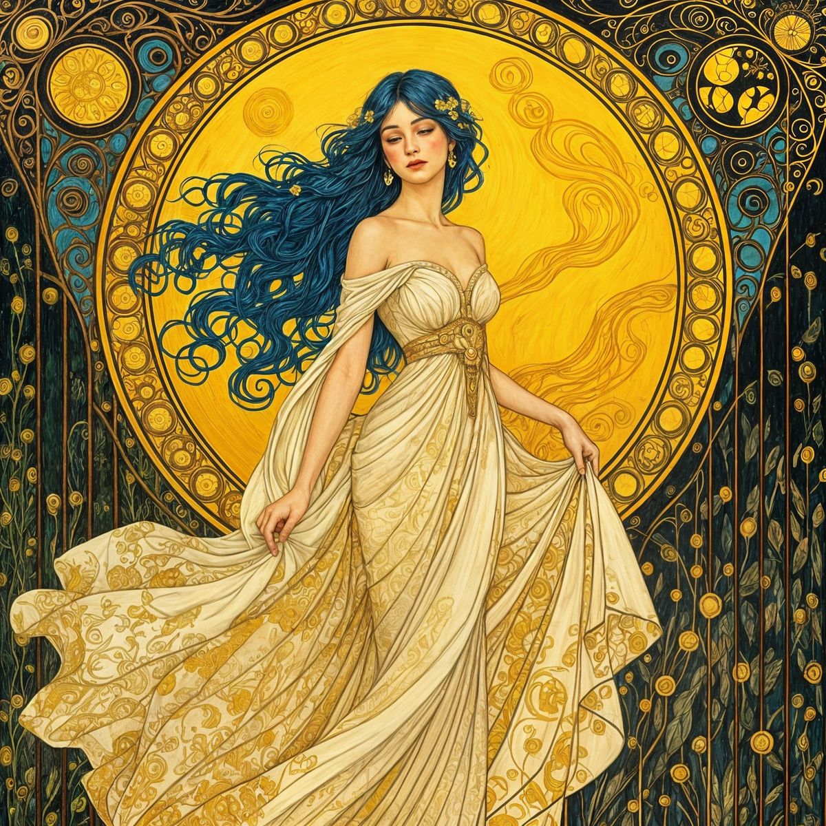 A captivating image of a woman with blue hair in the warm glow of sunset. The artwork evokes the style of early 20th century Art Nouveau painting.