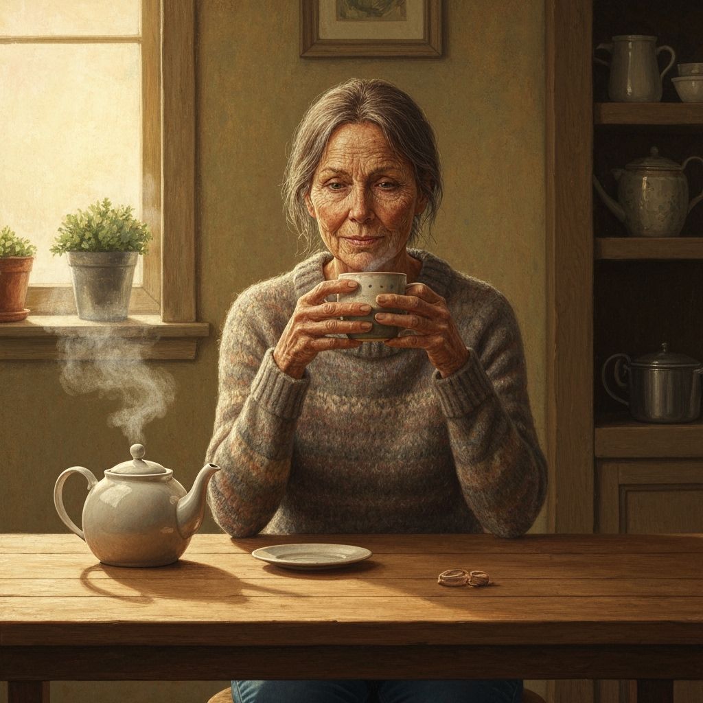 A cozy image of a middle-aged woman enjoying tea in her rustic kitchen. The scene is bathed in soft, golden light, reminiscent of American realism with subtle textures.