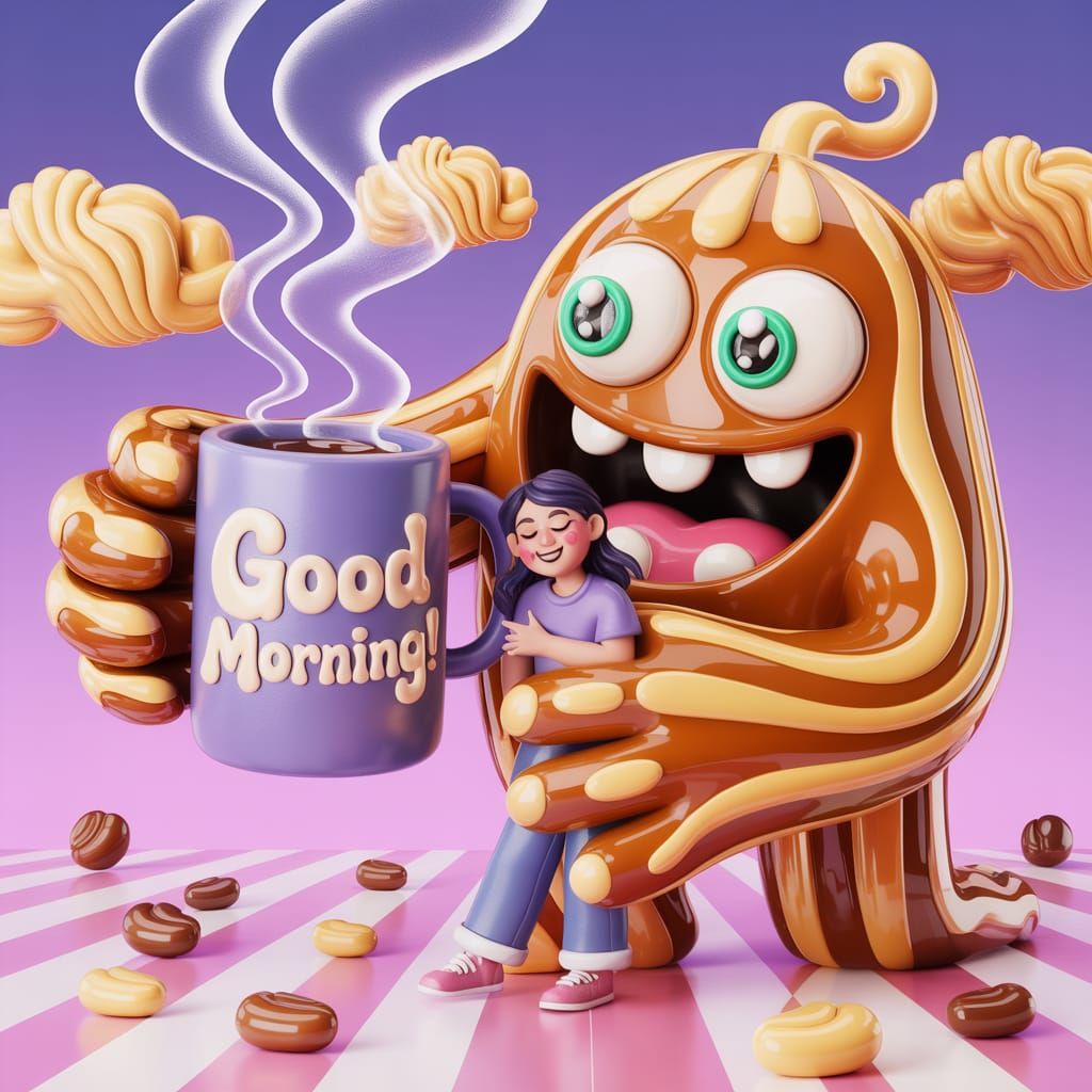 This image shows a candy-colored, whimsical scene of a giant coffee monster waking a woman. The digital illustration features pastel colors, swirling caramel patterns, and candy coffee bean accents.