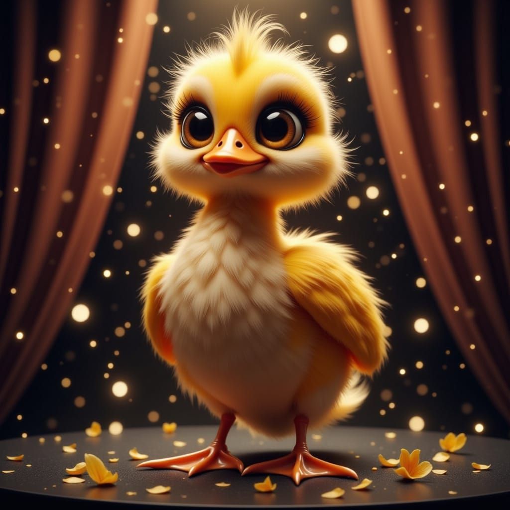 This image shows a duckling in a burlesque outfit dancing on an art deco stage. The image has a surreal, cinematic quality with sepia tones, gold accents, dramatic lighting and high contrast.