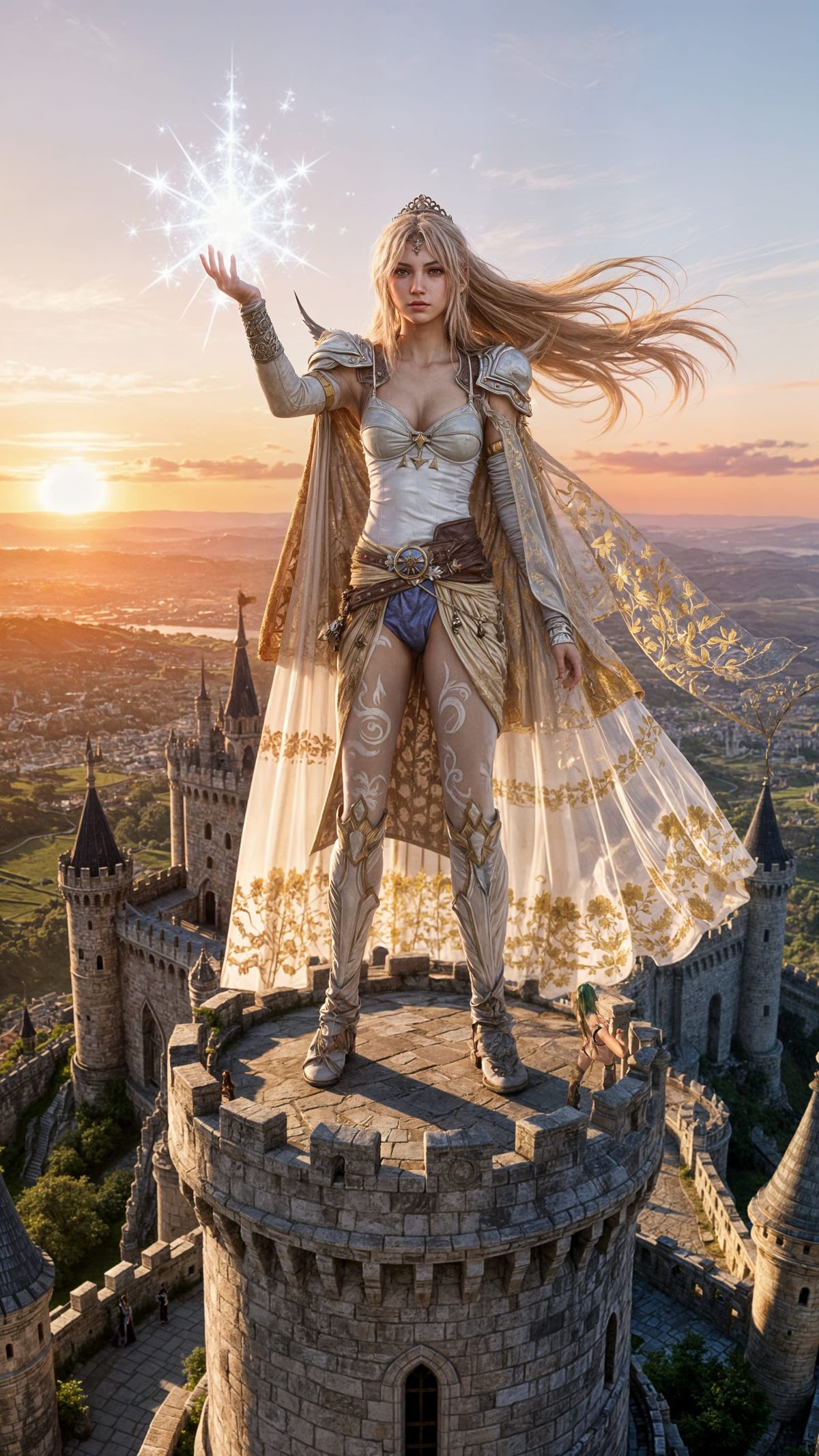 This image shows Rosa, a fit and beautiful young woman from Final Fantasy II, standing at dawn on a castle. Her hand glows with white magic as wind blows her hair. Cinematic and colorful.