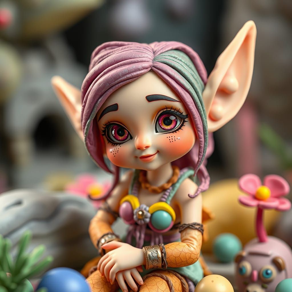 A hyperrealistic image presents a cute female elf formed from colorful clay. The whimsical scene features intricate textures and soft pastel hues, rendered as 3D digital art.