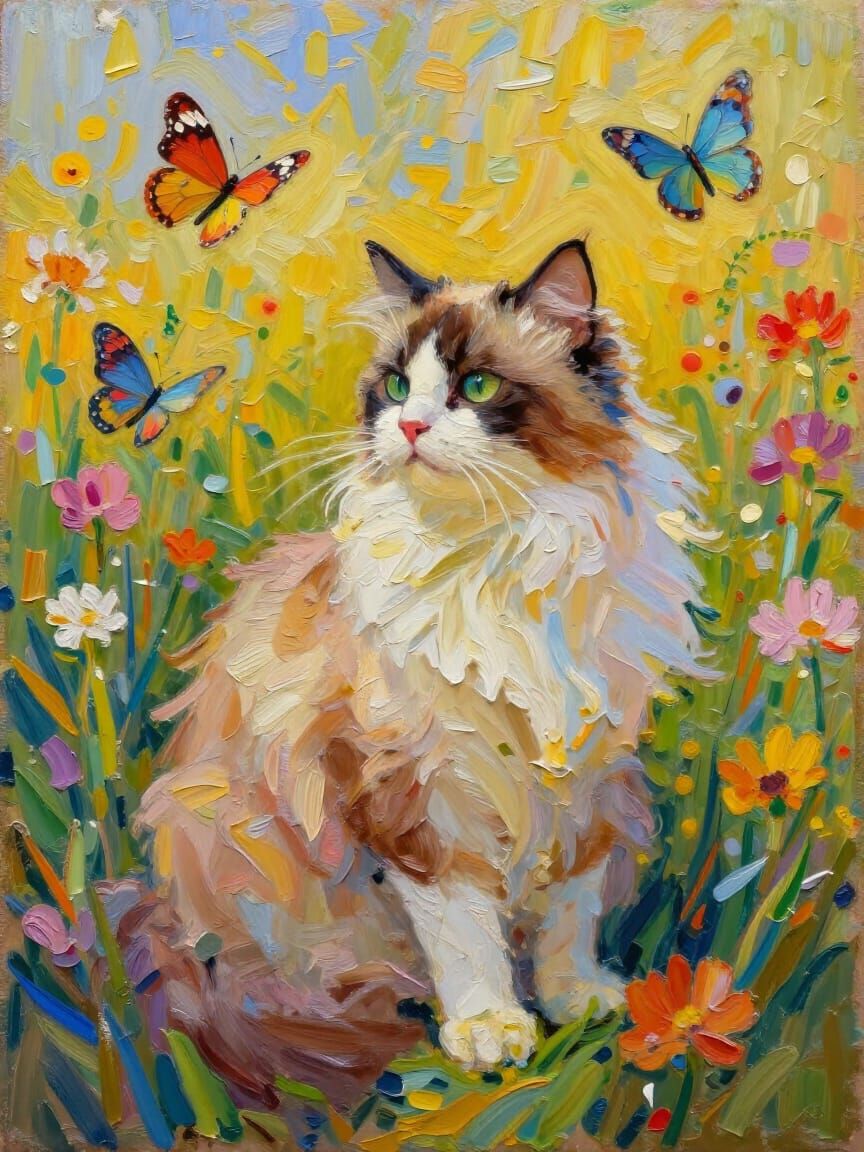 Generate your own unique impasto paintings of cats, flowers, and butterflies for free. Easy and fun!