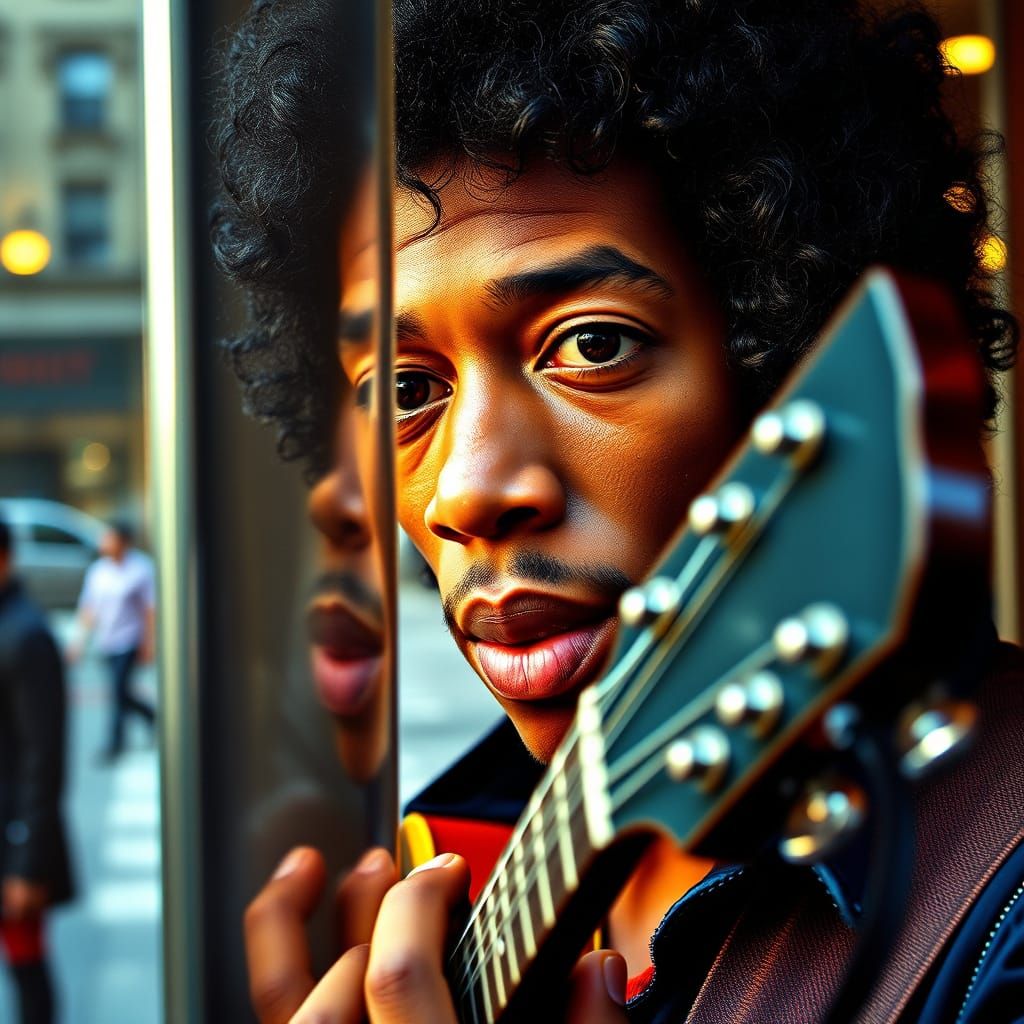 This ultra-high-resolution studio photo captures a 24-year-old Jimi Hendrix in NYC, 1966, looking at his reflection in a shop window. Features sharp eyes and detailed guitar.