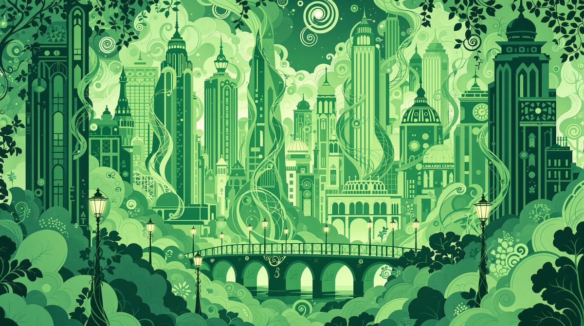 This image showcases an Art Nouveau cityscape with organic symmetry. Buildings feature ornate facades and graceful curves, rendered in shades of emerald and jade, evoking a vine-like aesthetic.
