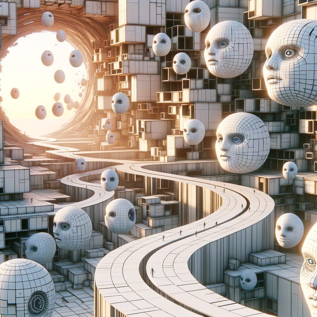 This detailed matte painting features a winding invisible road against a grey background, flanked by large broken windows and accompanied by a procession of abstract robot faces in white, gradually decreasing in size as they recede into the distance, creating a fantastical and intricate scene suitable fo...