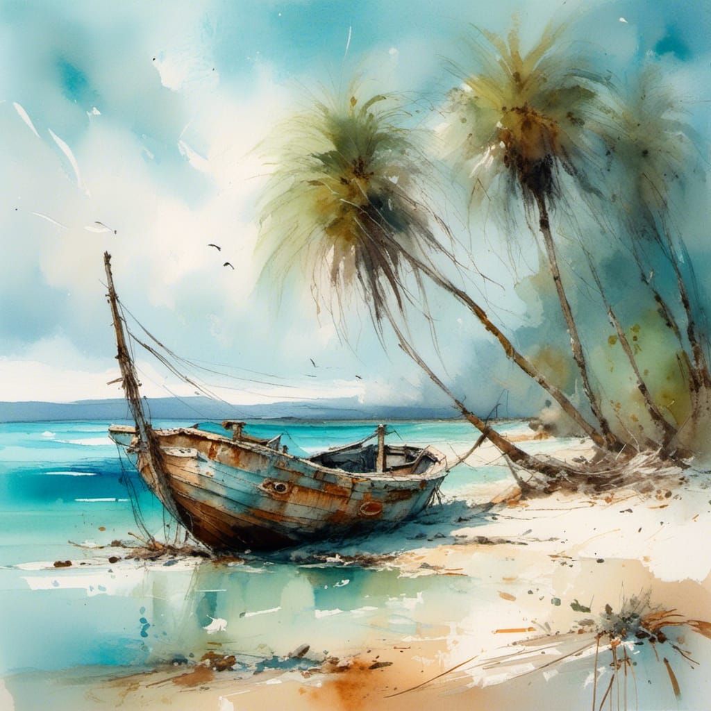 This image shows an old fishing boat stranded on a white sand beach. The watercolor painting style evokes a serene and nature-inspired atmosphere with soft brushstrokes and a gentle color palette.