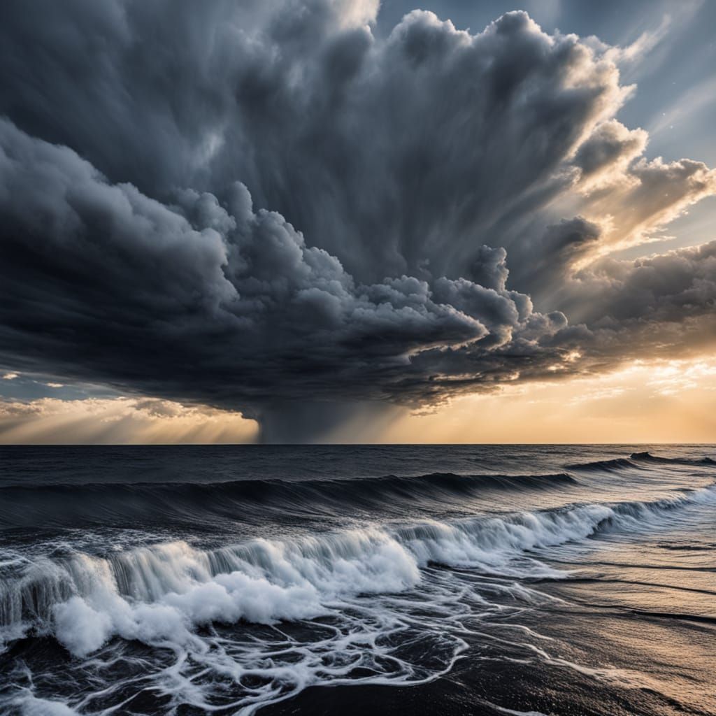 This image depicts heavy, ragged clouds emerging from a sea, obscuring the sky. Sharp contrasts highlight the dramatic scene as the horizon brightens.