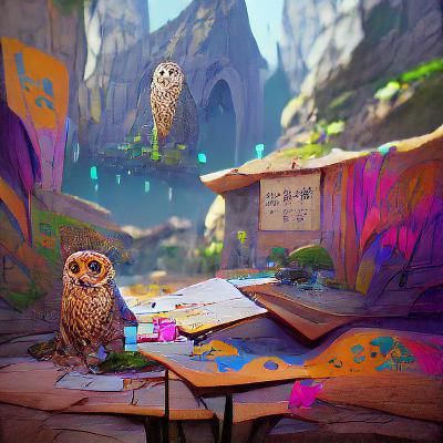 This image shows a female owl depicted as a teacher in a fantasy setting. The artwork features intricate details, deep colors, and a complementary color scheme, rendered as fantasy concept art.