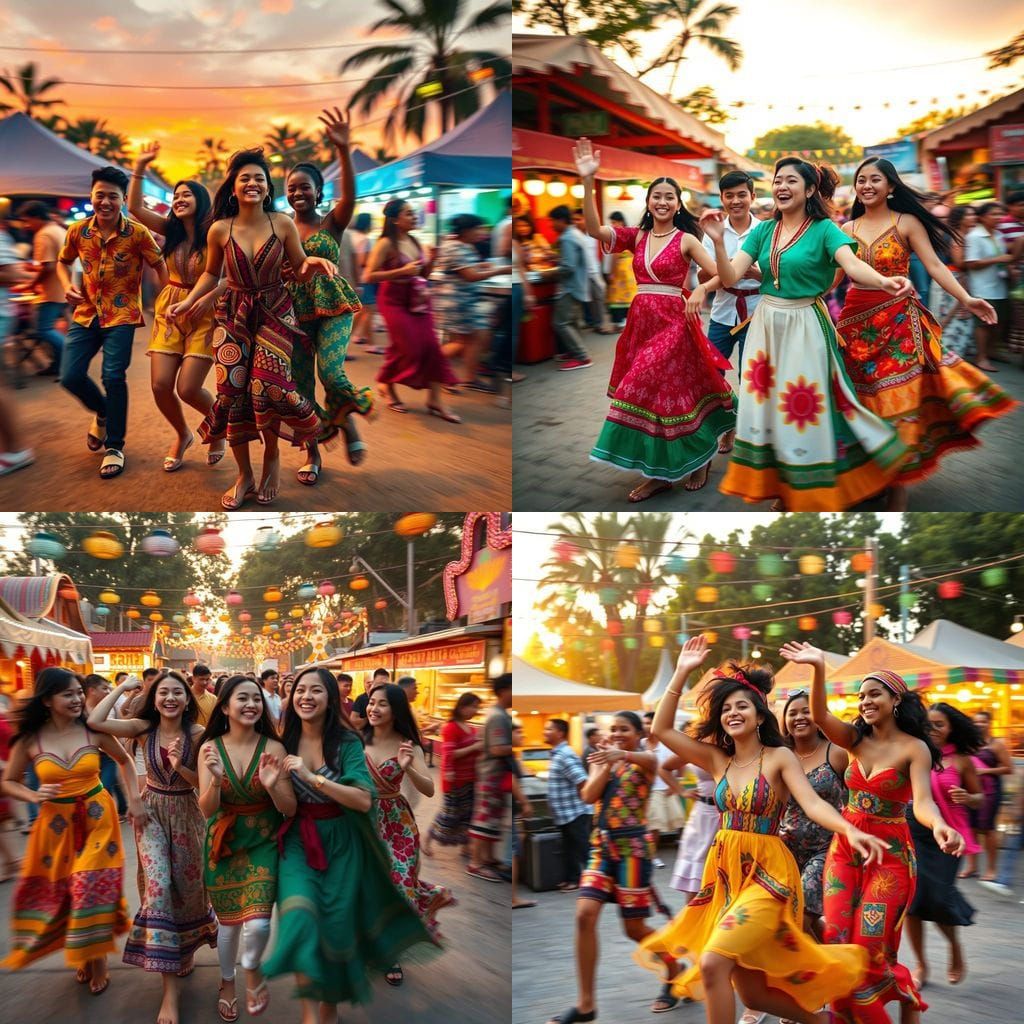 This image shows young people of different ethnicities dancing at an outdoor festival. The scene is full of colorful lights, musical instruments, food, and lively clothing. Motion blur and sunset lighting enhance the energy.